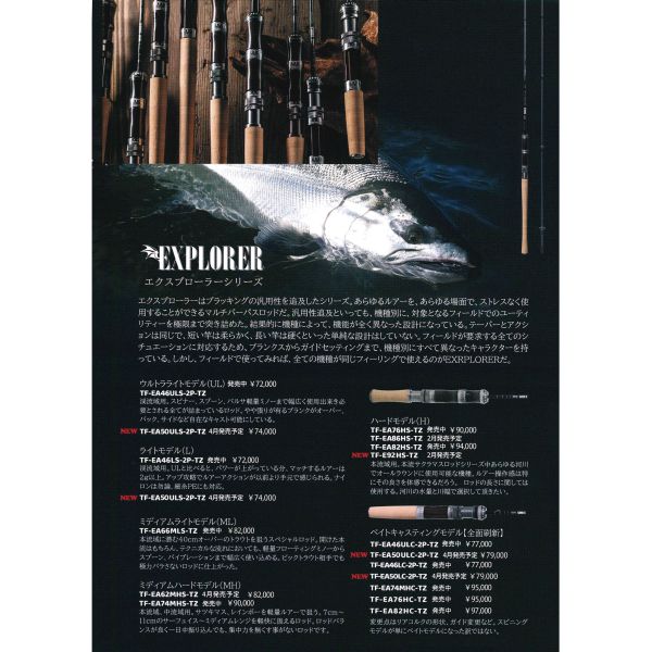 エクスプローラーはプラッキングの汎用性を追求したシリーズ。あらゆるルアーを、あらゆる場面で、ストレスなく使用することができるマルチパーパスロッドだ。汎用性追求といっても、機種別に対象となるフィールドでのユーティリティーを極限まで突き詰めた。結果的に機種によって、機能が全く異なった設計になっている。テーパーとアクションは同じで、短い竿は柔らかく、長い竿は硬くといった単純な設計はしていない。フィールドが要求する全てのシチュエーションに対応するため、ブランクスからガイドセッティングまで、機種別に全て異なったキャラクターを持っている。しかし、フィールドで使ってみれば、全ての機種が同じフィーリングで使えるのがEXPLORERだ。