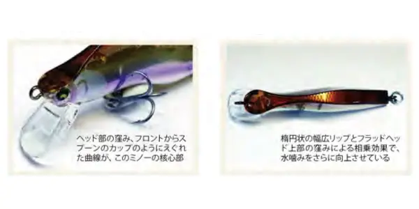 ハイプレッシャー河川でも大物に口を使わせるルアーで、スレた大物が潜む激流のボトムを、よりタイトに、よりナチュラルにトレース可能なヘビーウェイトのシンキングミノー。 形状は、上から見るとスリムな瓢箪型で、横から見ると「へ」の字型。この独自のボディ曲面に、ヘッド上部の窪みを加えた超独特な形状が激流の水圧を利用し、受け流すことで、ダウンフォースを得て複雑な流れの中でも抜群なレンジキープ力を発揮し、重くてもキビキビ動きます。 このキレの良さはアングラーの手元にも素早く伝わり、このレスポンスの良さは操作性の良さにも繋がります。 この小さなミノーにボトム攻略のための全てが注ぎ込まれています。SPEC