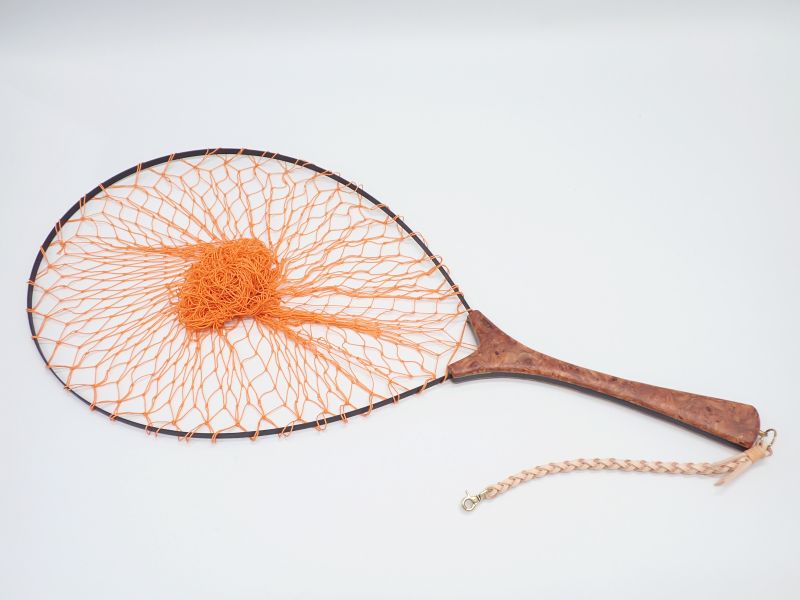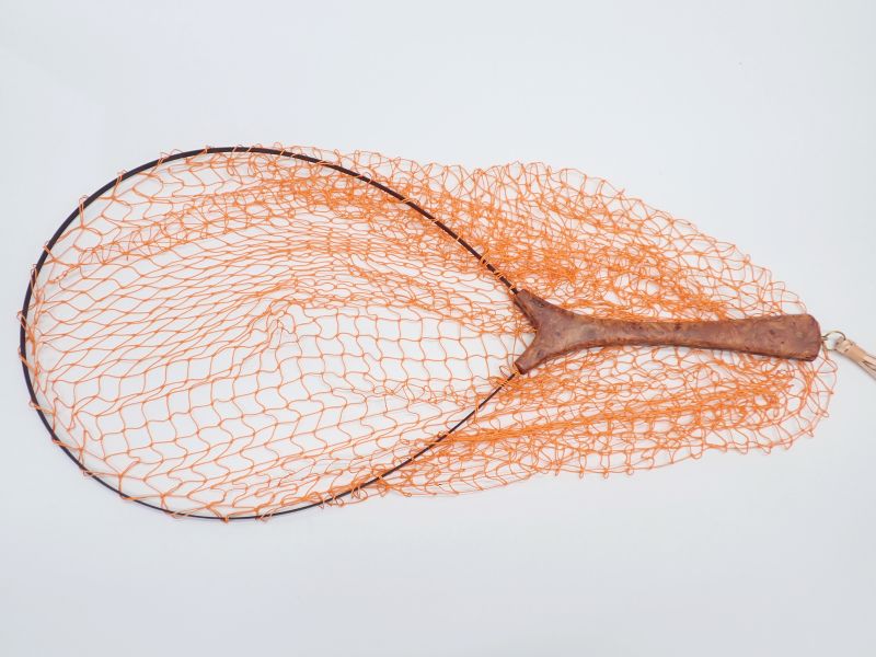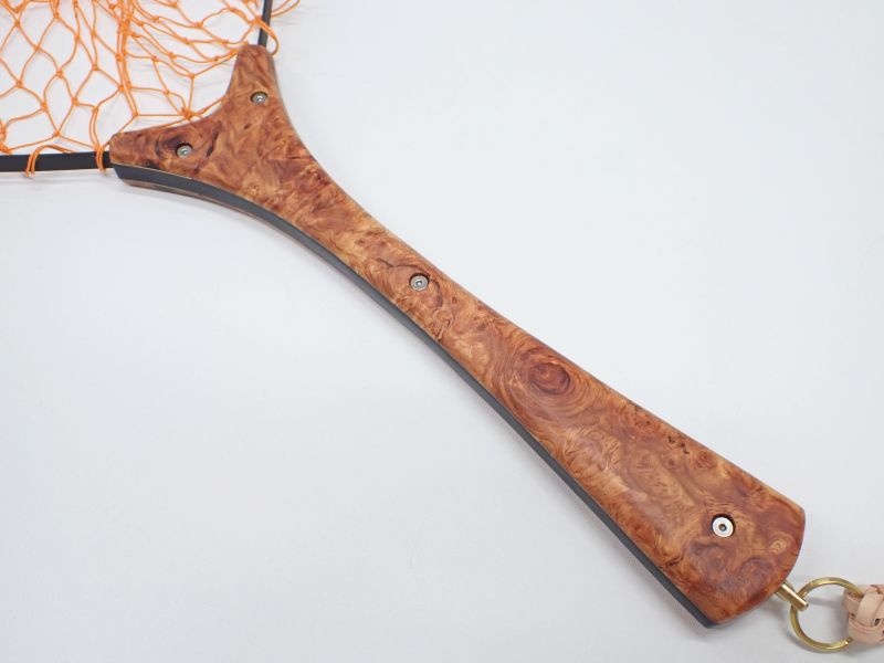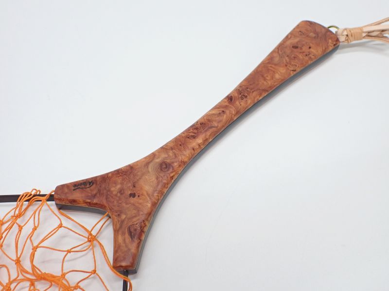 2010年から製作を始めて改良を重ねながら現在に至っています。本流釣りの名手である安田龍司さんの発案で作り始めフィールドテスターをして頂いています。従来のスプリングネットは使い込んでくるうちに横から見ると金属フレームが歪んでしまうことがありますが、Alberoのフレームはほぼ歪むことがありません。手編みネットは革ケースから取り出す時にずれないようにハンドル側からループを止めています。ハンドル材はレジンをスタビライズドさせた後に蜜ろうオイルで仕上げてあります。