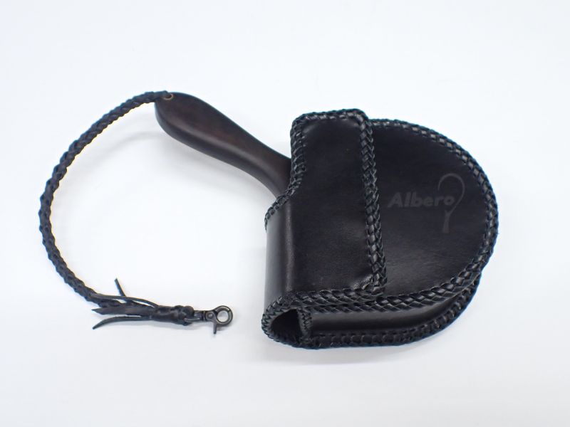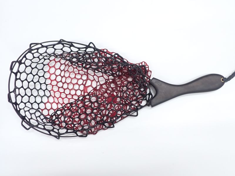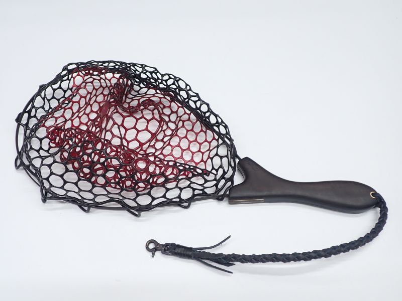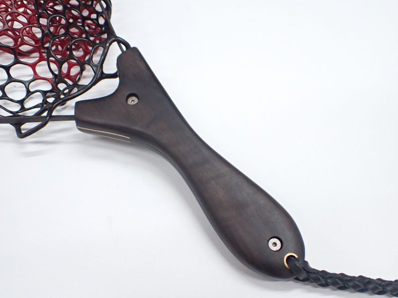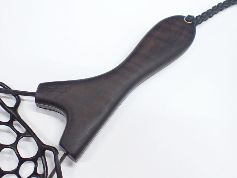 2010年から製作を始めて改良を重ねながら現在に至っています。本流釣りの名手である安田龍司さんの発案で作り始めフィールドテスターをして頂いています。従来のスプリングネットは使い込んでくるうちに横から見ると金属フレームが歪んでしまうことがありますが、Alberoのフレームはほぼ歪むことがありません。手編みネットは革ケースから取り出す時にずれないようにハンドル側からループを止めています。ハンドル材はレジンをスタビライズドさせた後に蜜ろうオイルで仕上げてあります。