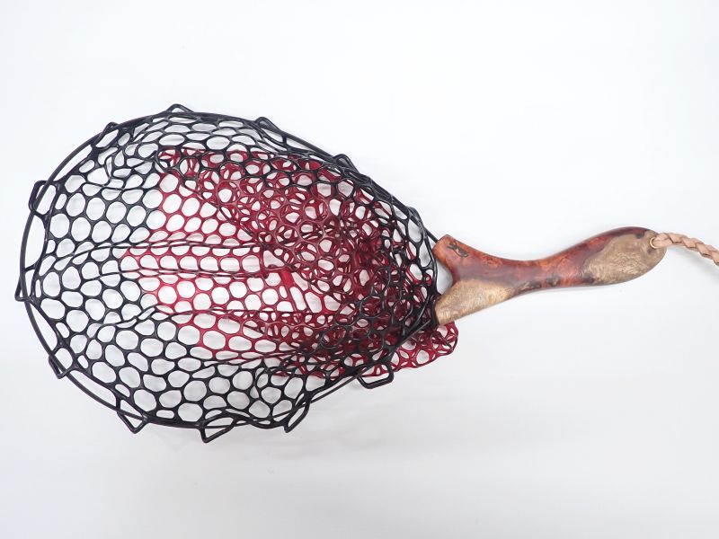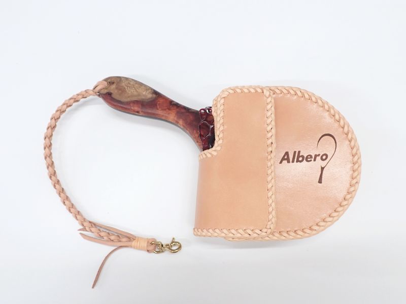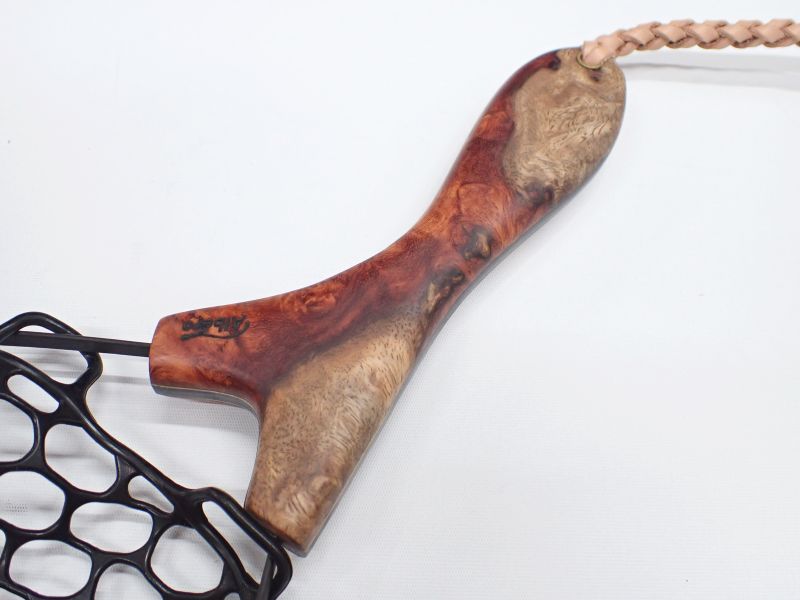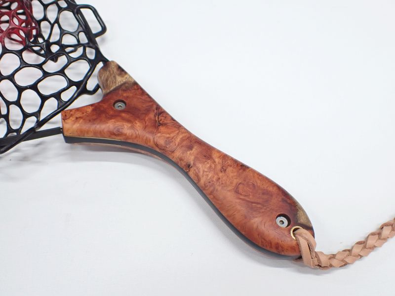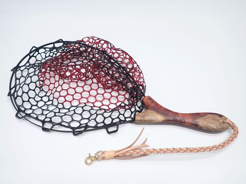 2010年から製作を始めて改良を重ねながら現在に至っています。本流釣りの名手である安田龍司さんの発案で作り始めフィールドテスターをして頂いています。従来のスプリングネットは使い込んでくるうちに横から見ると金属フレームが歪んでしまうことがありますが、Alberoのフレームはほぼ歪むことがありません。手編みネットは革ケースから取り出す時にずれないようにハンドル側からループを止めています。ハンドル材はレジンをスタビライズドさせた後に蜜ろうオイルで仕上げてあります。