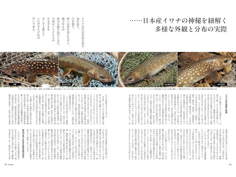 氷河時代に北方から日本へ訪れ、大気気温の上昇とともに山岳部へ取り残されたイワナ。一般的にはアメマス(エゾイワナ)、ニッコウイワナ、ヤマトイワナ、ゴギと4亜種に分けられますが、それにとどまらない多様な外観を持っています。本書では、全国にイワナを追いかける佐藤成史さんが、最新の研究を紹介しつつ、多数の写真を整理し、考察します。 本書で地理的に分類したのは、北海道エリア、東北エリア、関東エリア、中部北陸エリア、中部東海エリア、近畿エリア、中国エリア、四国・九州エリアです。北からグラデーションで変化していく外観、それぞれの地域に住む魚の相違点と類似点など、日本の地形と照らし合わせるとさまざまなドラマを想像することができます。 また、「エゾゴギ」、「天目イワナ」、「ヒライワナ」、「ヤマトイワナ」に関する独立したエピソードも収録。全国の多様なイワナの写真をここまで集めたものはこれまでにないものです。「日本の渓流には、こんな魚が太古から住んでいるのか」と、渓流釣りファンだけでなく、森や山の自然に興味のある方なら驚嘆するはず。 彼らの神秘的な姿をご堪能ください。