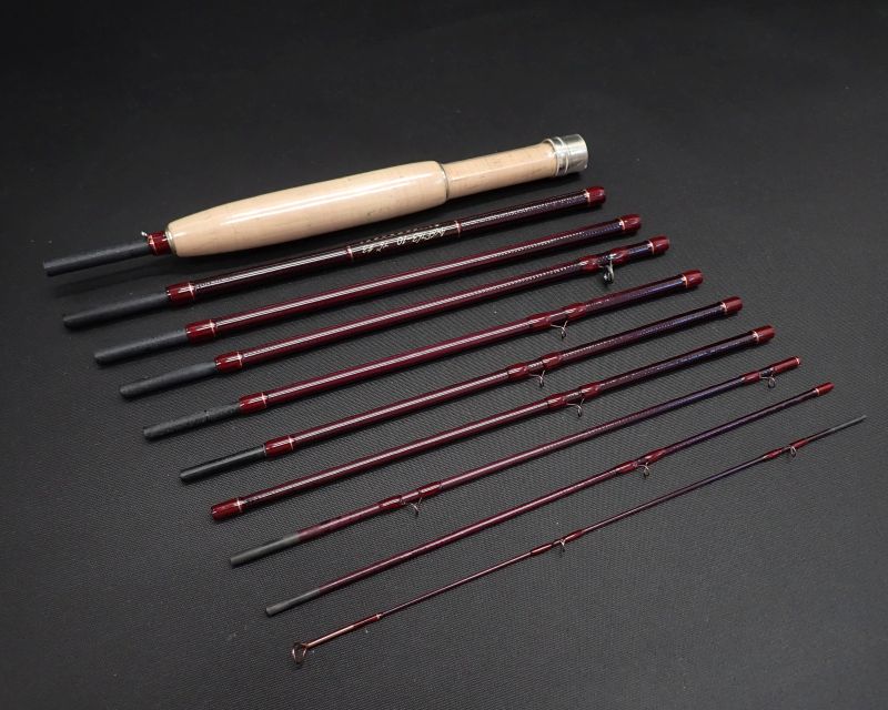 ワンピースが26cm、30㎝のケースに収まるコンパクト設計。バット部には平織カーボン素材を使用し振動とねじれの発生を抑えました。バットパワーのあるパラボリックなミディアムファスト。スムーズにベンドする小継を感じさせないアクションは力強くよどみのないループを投射します。ワインレッドの美しいブランクにブロンズカラーのガイド、フェルールのラッピングにはシルバーとレッドのティッピングと凝ったあしらい。バットにはグリズリーハックルがラッピングされています。未使用品です。