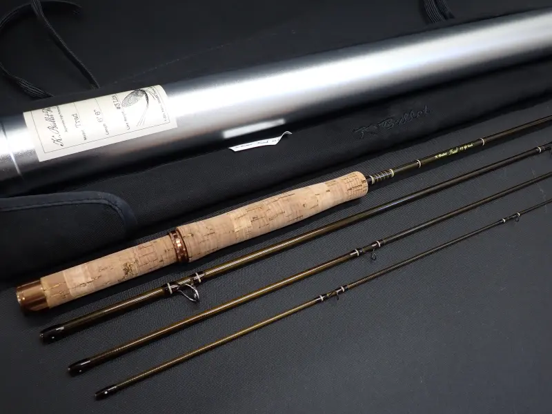 オリーブブラウンのブランクにダークブラウンとアイボリーの飾り巻き、コンパクトなグリップにコパーのリング&ポケットの金具、クラシカルで美しい仕上がりのショートロッドです。至近距離での釣りを想定しラインをほとんど出さない状態でもロッドを軽く振るだけでテップが俊敏に反応し、確りしたループによりフライを綺麗にターンさせるミディアムアクション。グリップの使用感多目。ブランクは綺麗です。