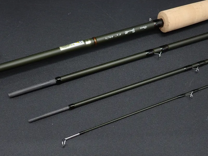 低反発カーボンによるグラス素材に近いしなやかで粘りのあるブランク。ラインと一体感のあるキャストフィールで近距離から中距離まで様々なシチュエーションで活躍します。グリップの形状は手になじみやすいショート・リッツタイプ。8645はボリュームのあるフライも楽にターンオーバーさせ、渓流や本流の大型トラウト、レインボーをターゲットにした一本。使用感は無く実釣未使用品と思われます。