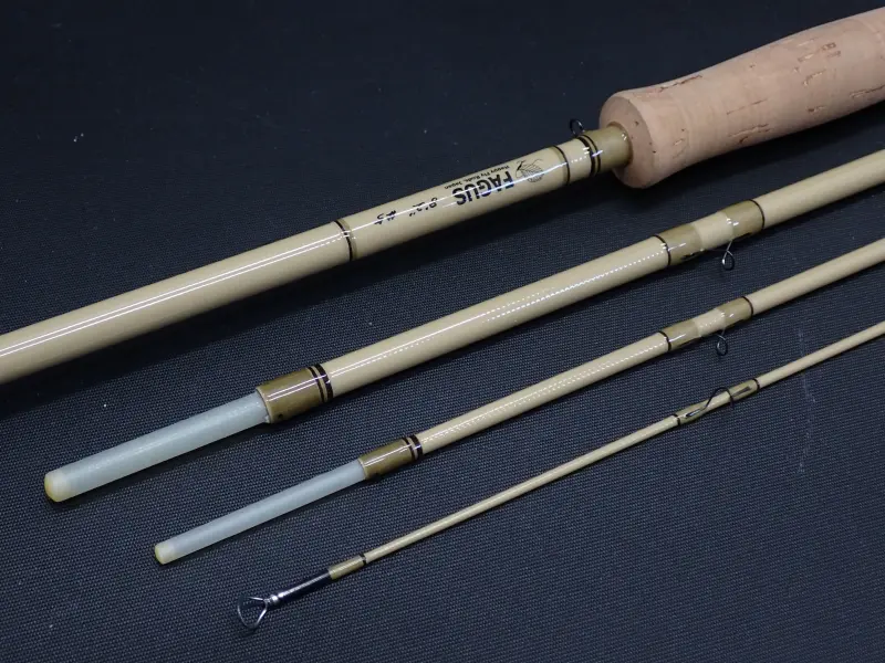 戻りの速いのユニディレクショナルSグラスをマテリアルとしたパワフルなファストアクション。ビッグドライや重いニンフを使った釣りにもお勧め。ナチュラルなビスケットカラーのブランクにウォールナットのフィラーの落ち着いた雰囲気のロッドです。大型トラウトとのファイトでも頼りになる一本。使用感かなり少な目。グリップに若干の汚れあり。