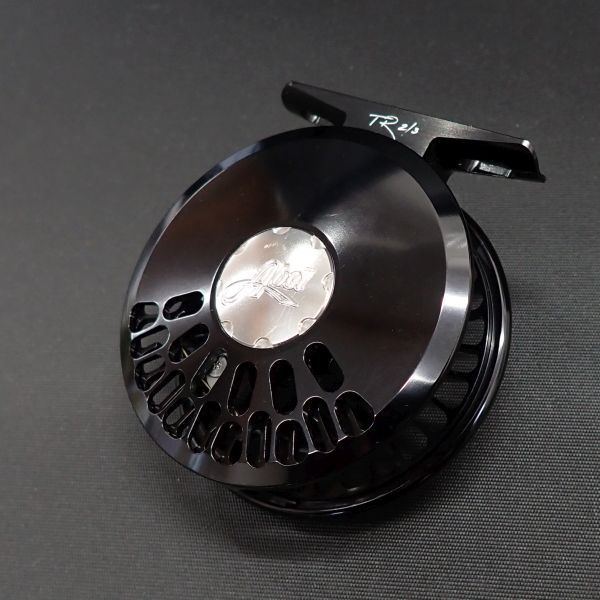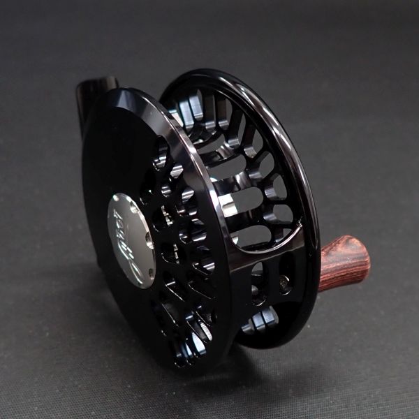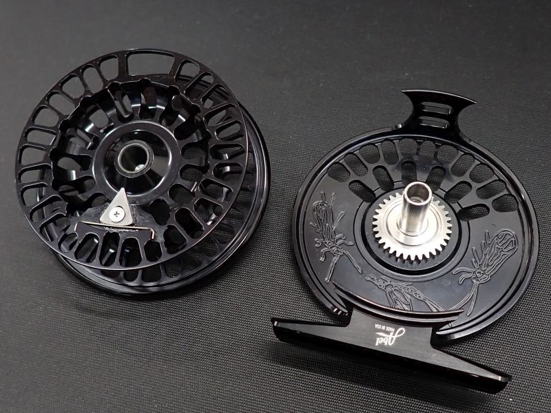 ラージアーバー化したスプールは大胆に肉抜きされています。クリッカーをスプール側に取付、本体側にギアを設置したユニークな構造により本体フェースはすっきりしたデザインとなりました。かっちりとしたクリック感。スプール内側にはメイフライ・カディス・ストーンフライのシルエットが切削彫刻。塗装はエーベル伝統の厚く艶やかな黒塗りです。