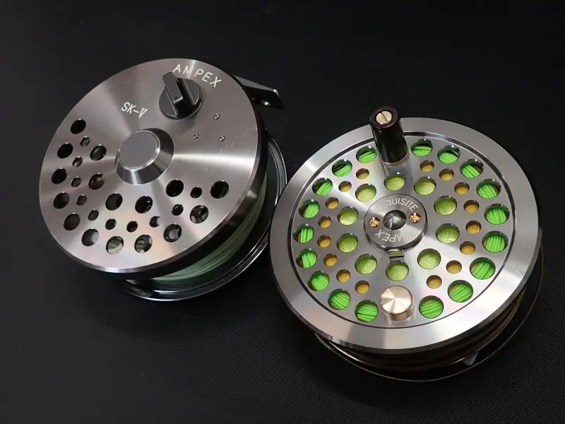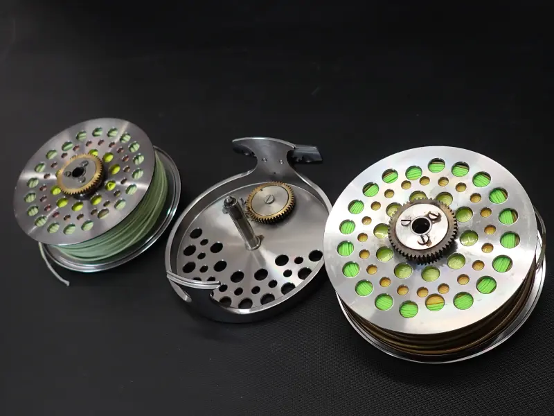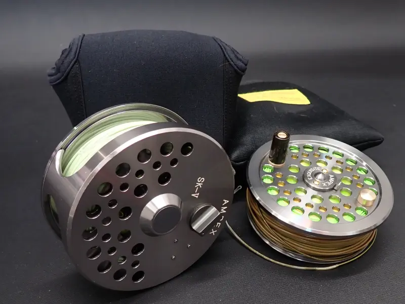 アルミ削り出しの美しく丈夫なリール。正転サイレントフリー。逆転緻密なラチャット。使用感は少な目。所々微細な傷あり。スプールは各々、フローティングとシンキングのスペイヘッドが巻かれています。詳細は不明。おまけです。