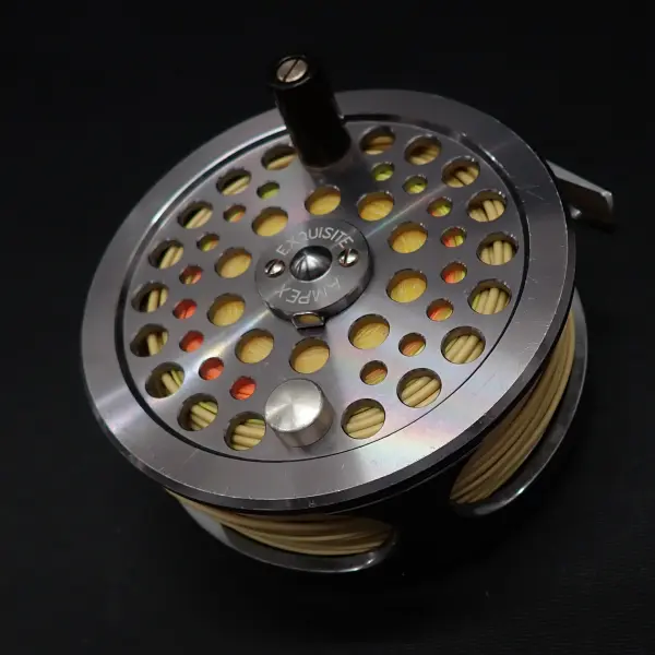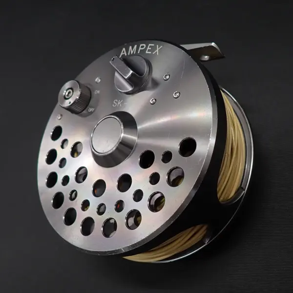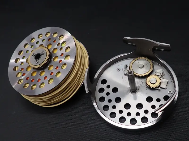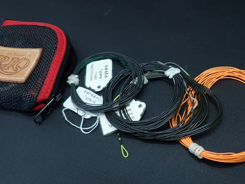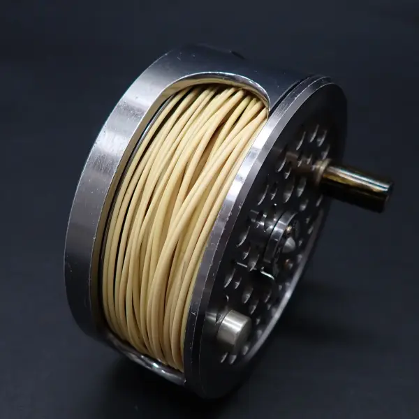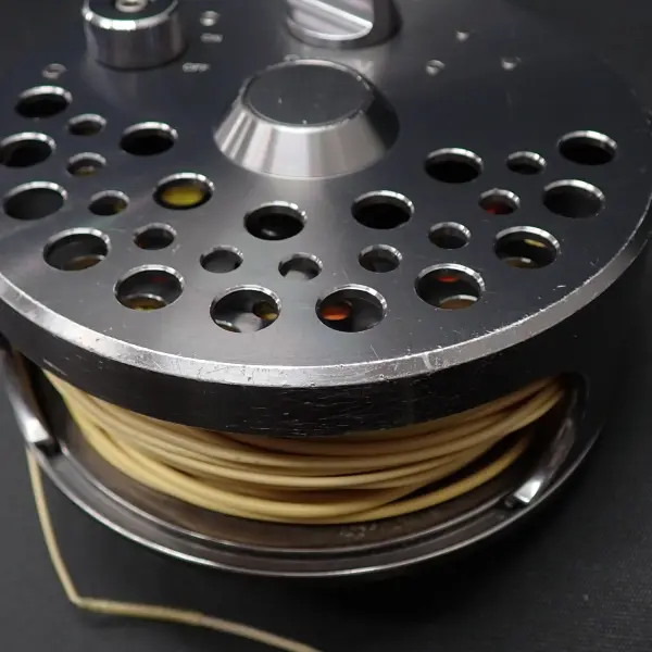 アルミ削り出しの美しく丈夫なリール。正転サイレントフリー。逆転緻密なラチャット。スペイモデルはスプールをフリーにする切り替え機能付き。外周部を中心に全体的に細かな傷あり。機関良好。フローティングのスペイラインが巻かれています。リオのワレットに入ったティップ付き、ともに詳細は不明。おまけです。