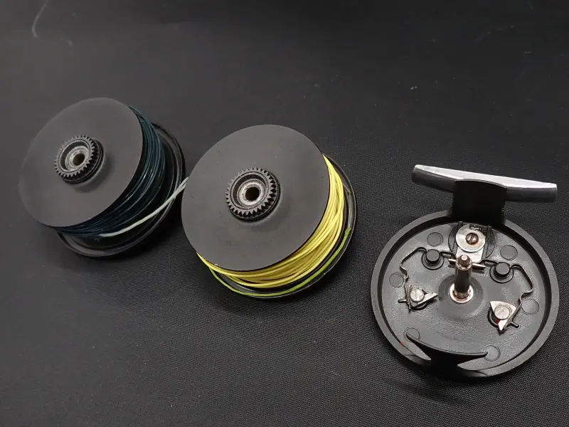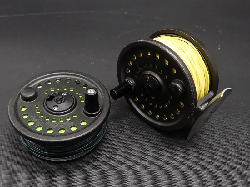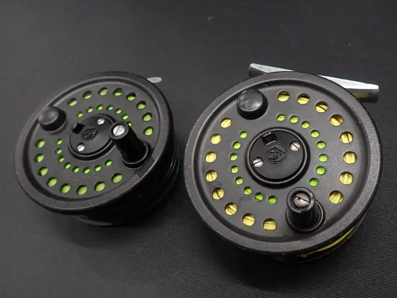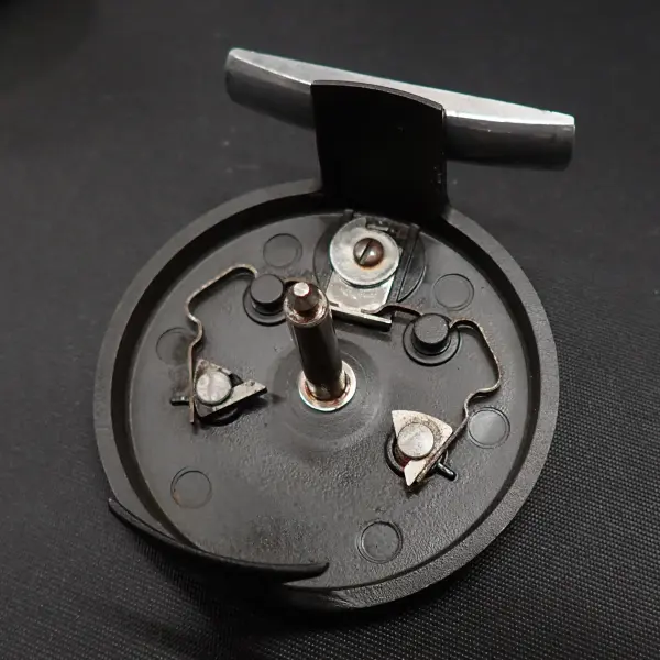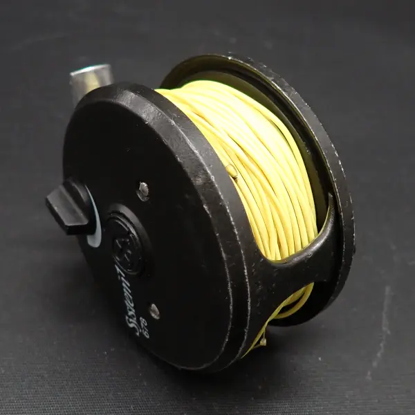 アルミダイキャスト製、シンプルな構造の堅牢な英国製クリック式リール。全体的に擦れ小傷多目。内部に錆の発生がみられます。クリックも確りと利き動作良好。スプールにWF6Fと思われるラインとシンキングのヘッドが巻かれています。詳細は不明おまけです。用途が合えばお得。