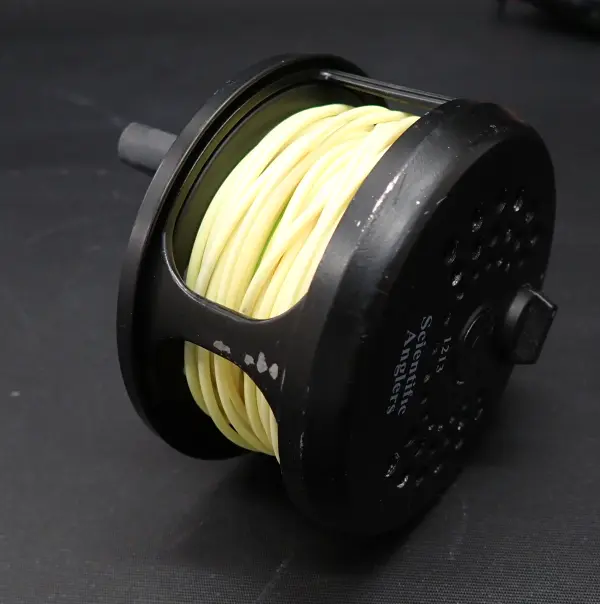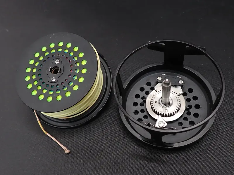 アルミダイキャスト製、堅牢な英国リール。シンプルな機構のディスク式ドラグ。滑らかさは現行リールには及びませんが、調整も確りと利き実用十分です。所々擦れ小傷、塗装剥げあり。機関良好。スペイヘッドが巻かれています。リオのワレットに入ったティップ6本付き、ともに詳細は不明おまけです。用途が合えばお得。