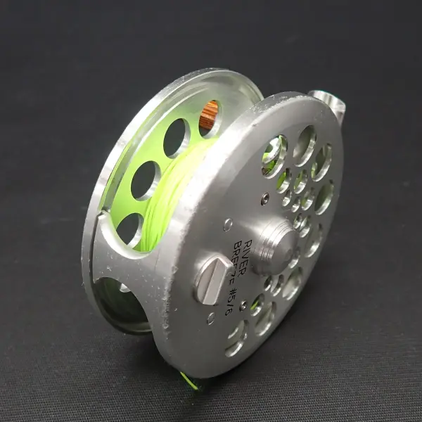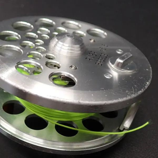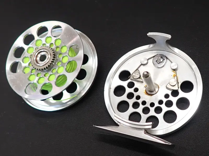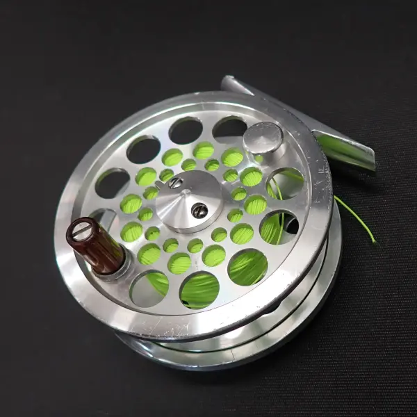 アルミ削り出しのシンプルなデザインの確りとしたクリック式リール。外周部を中心に全体的に擦れ小傷多目です。クリックテンションは確りしており機関良好。バッキングが巻かれてます。詳細は不明です。