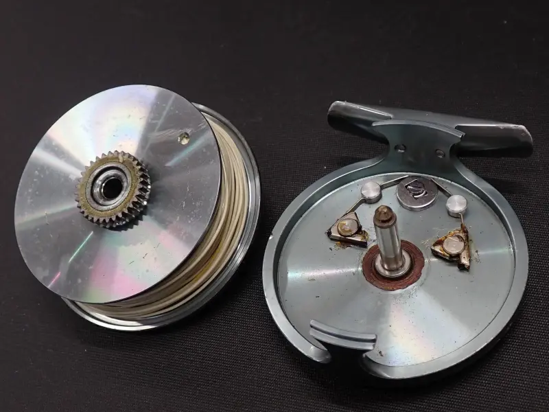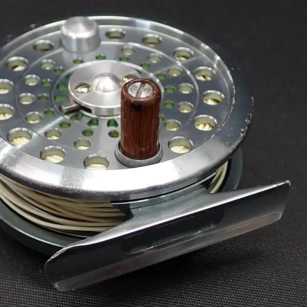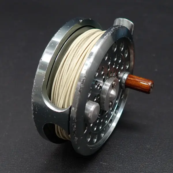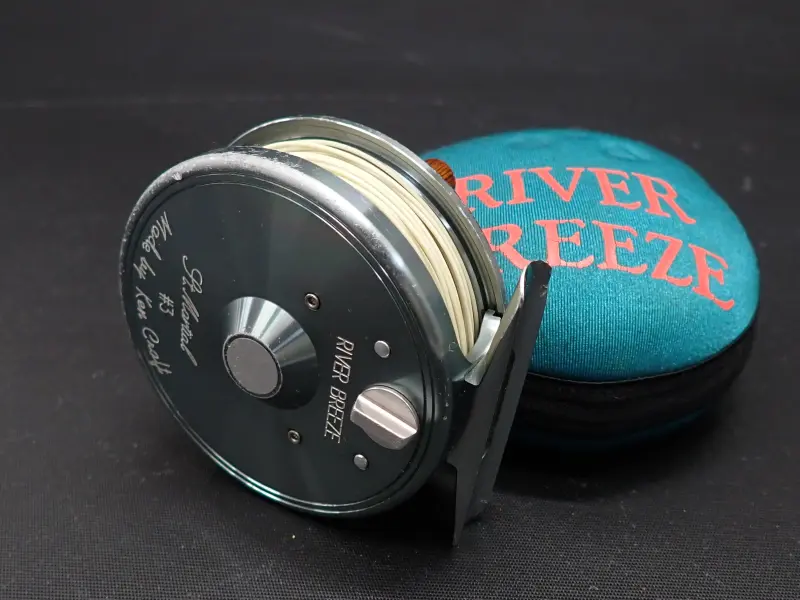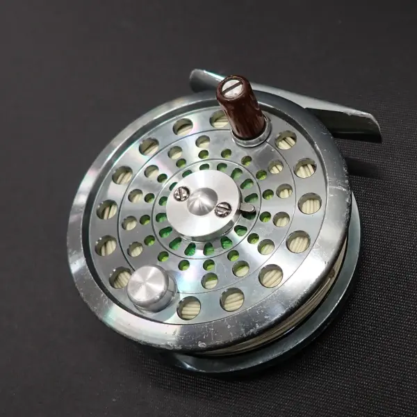 アルミ削り出し、ライトブルーに染色された高級感のあるクリック式リール。リバーブリーズシリーズのフラッグシップモデル。外周部を中心に全体的に擦れ小傷多目です。リールシートの角に歪みあり。クリックテンションは確りしており機関良好。ラインが巻かれてます。詳細は不明おまけです。