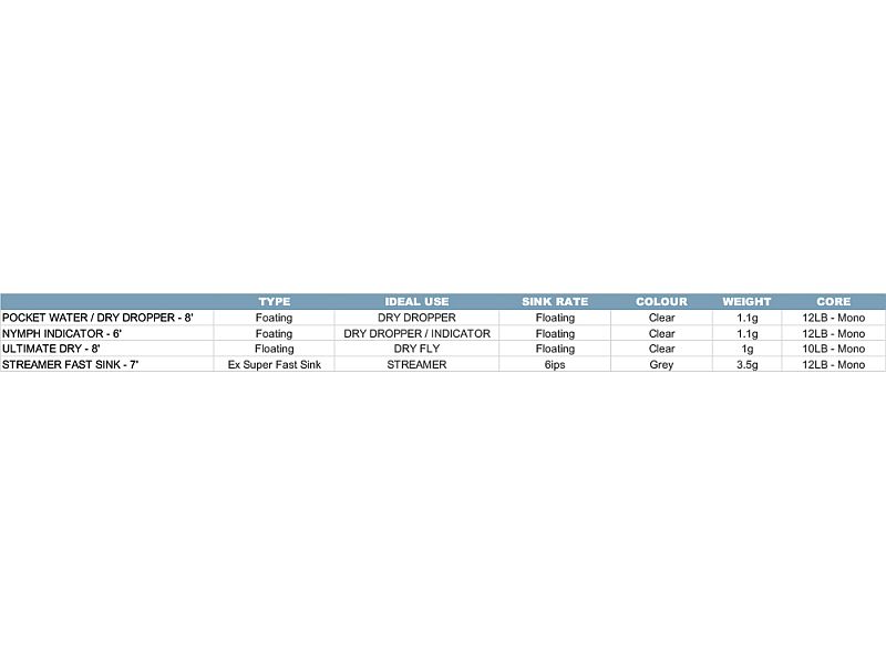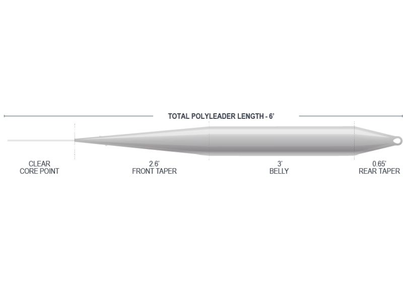 長いリアテーパーとヘビーなフロントテーパーのこのポリリーダーは、インディケーターと5~8フィート程度のティペットをつけての使用がベストです。
