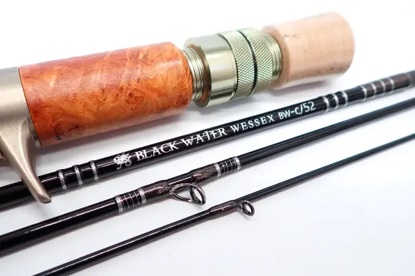 弾性の違うカーボンシートの組み合わせにグラスファイバーを3割程度コンポジットしており、ダルさは排除しながらも硬すぎない絶妙な張りがあり、かつ繊細なティップでキャスティングのしやすさとルアーアクションのしやすさの両立させることに成功しました。 渓流ベイトロッドで、グラスでは柔らかすぎと感じたり、カーボンのみのブランクでは固すぎると不満を感じている方にとってはちょうどよく感じるコンポジットブランクスを採用しています。 BLACK WATERシリーズのハンドルはリールシート部分が花梨バール材、グリップ材はAAAAグレードの高品質コルクを採用しています。 他メーカーのコルクグリップは良くてAAAグレードが多い中、AAAAグレードにこだわった理由としては見た目の穴の少なさというだけでなく、コルク密度の高さによる反発力の有る握り心地は他の素材には得られないものだからです。 グリップのジョイント部分が目立たないようにこのロッド専用パーツを作成いたしました。 フィネスなロッドながら、不意の大物にも手首の力を保持できるように、トリガーからエンドまでの長さもベイトフィネスロッドとしては長めの175mmに設定。 昨今多くなっている4フィートクラスのショートロッドと違い、障害物のかわしやすさ、もっと飛距離が欲しい場合などに有利なレングスとなっています。 BW-C/52は、WESSEXのベイトロッド中もっとも扱いやすいフィネスアクションになっており、ヘビーシンキングミノーやスプーン、スピナー、軽量なバルサミノーや小型のトップウォータープラグに至っても繊細なティップを生かして軽妙なロッドワークをしやすくしております。 WESSEXトラウトロッドはガレージブランドらしく、少ない製造数であってもオリジナルのパーツ類の開発等細かい箇所に一切の妥協をせずに作成している為、そこらのマスブランドとは一線を画していますので価格もそれなりに張りますが、長くご愛用頂けるためのこだわりを随所に設けてあります。 この度は最もお勧めしたいベイトロッドの登場です。 是非ご検討ください。SPEC