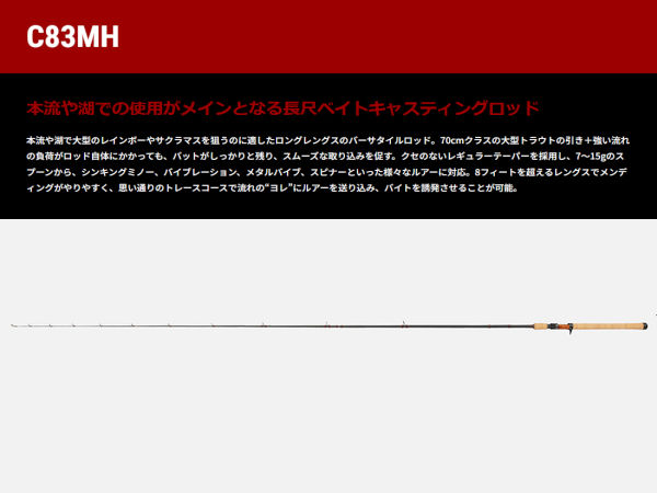 長尺ベイトキャスティングモデル。 本流や湖で大型のレインボーやサクラマスを狙うのに適したロングレングスのバーサタイルロッド。SPEC