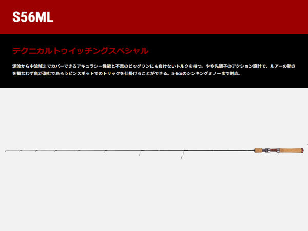 テクニカルトゥイッチングスペシャル。 源流から中流域までカバーできるアキュラシー性能と不意のビッグワンにも負けないトルクを持つ。やや先調子のアクション設計で、ルアーの動きを損なわず魚が潜むであろうピンスポットでのトリックを仕掛けることができる。5-6㎝のシンキングミノーまで対応。SPEC