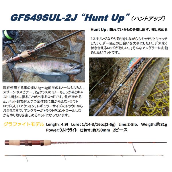 Hunt Up : 隠れているものを探し出す、探し求める 「スリリングなやり取りをしながらもキッチリとキャッチしたい。」「一匹との出会いを大事にしたい。」「末永く付き合えるロッドが欲しい。」そんなアングラーにお勧めしたいロッドです。 現在使用する事の多い3g~4g前半のミノーはもちろん、スプーンやスピナー、2gクラスのミノーもしっかりとキャストし軽快に操ることが出来るロッドです。 魚が掛かると、バット部で耐えつつ全体的に曲がり込むトラウトロッドらしいアクション。 レギュラーサイズのトラウトから尺クラスまで、アングラーがトラウトをコントロールしながらやり取りを楽しめるロッドになっています。SPEC