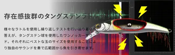 様々なラトルを使用し繰り返しテストを行い辿り着いた答えが、タングステン球を使用したワンノッカーサウンド。 それぞれにベストな玉のサイズを使用することにより独自のサウンドを奏で広範囲から魚を引き寄せます。