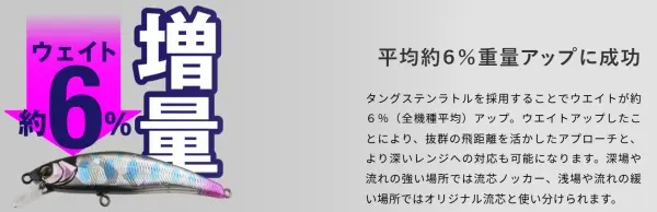 タングステンラトルを採用することでウエイトが約6%(全機種平均)アップ。 ウエイトアップしたことにより、抜群の飛距離を活かしたアプローチと、より深いレンジへの対応も可能になります。 深場や流れの強い場所では流芯ノッカー、浅場や流れの緩い場所ではオリジナル流芯と使い分けられます。