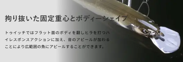 トゥイッチではフラット面のボディを翻しヒラを打つハイレスポンスアクションに加え、音のアピールが加わることにより広範囲の魚にアピールすることができます。