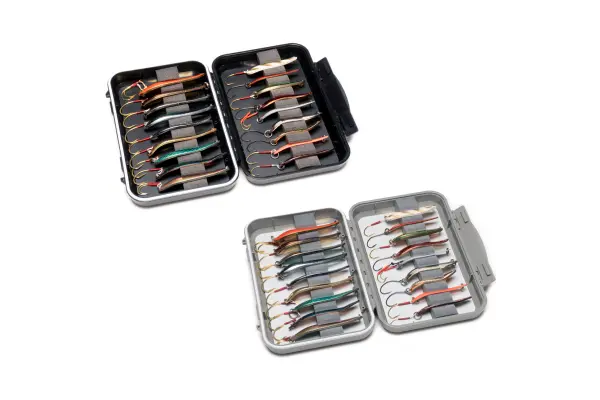 10~21gの本流・湖用のスプーンを最大18枚まで収納できるルアーケースです。 キーパーフォームに挟まれたスプーンのフックを底部に内蔵した強力なネオジウムマグネットが保持します。 キーパーフォームのスリットは斜めに切られスプーンの表面が見えるためルアーセレクトも容易です。 ●サイズ(W×H×D):185×42×108(mm) ●本流、湖用スプーンの収納に最適なルアーケース ●10~21g クラスまでのスプーンを 18 枚収納可能 ●ケース底部に 18 個のネオジムマグネットを内蔵、強力な磁力でフックを固定 ●キーパーフォームがスプーンをしっかりとホールド ●カラー:ライトグレイ or ブラック