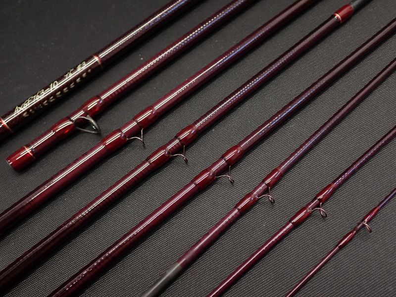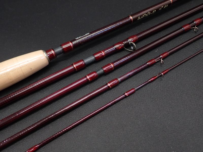 ワンピースが26cm、30㎝のケースに収まるコンパクト設計。バット部には平織カーボン素材を使用し振動とねじれの発生を抑えました。バットパワーのあるパラボリックなミディアムファスト。スムーズにベンドする小継を感じさせないアクションは力強くよどみのないループを投射します。ワインレッドの美しいブランクにブロンズカラーのガイド、フェルールのラッピングにはシルバーとレッドのティッピングと凝ったあしらい。バットにはグリズリーハックルがラッピングされています。未使用品です。