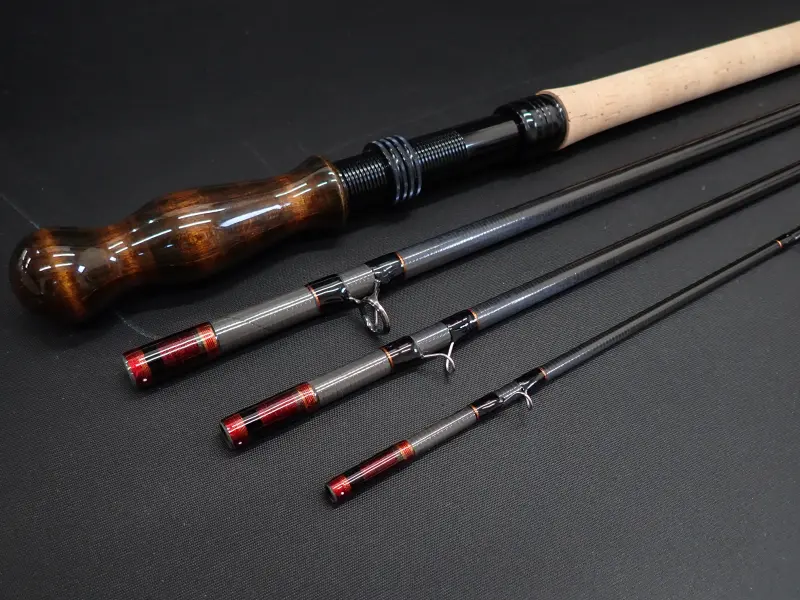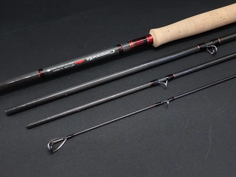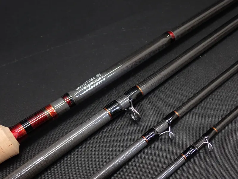 30tローレジンカーボン50%とガラスクロス50%の粘りのあるブランク。バットからティップまで、かなりパワフルでトルクのあるショートツーハンドロッド。リアグリップ330mm。ロアーグリップ120mm。全長570mmの取り廻しの良いハンドル。丈夫なアンサンドフィニッシュ。トップとストリッピングはチタンSICガイド、各ガイドラッピングはフルトリム。フェルール及びバット部はメタリックのレッド&コパーの工芸的なスレッドワークで仕上げられています。中規模河川でビッグトラウト、サクラマス狙いに最適。キャストのスタイルを選ばず様々なラインに対応。フルラインはショートヘッドスペイ8/9。スカンジナビアンヘッドではオーバーヘッドメインの場合450gr/アンダーハンドメインで520gr。スカジットヘッドは550grとなります。 使用感は無く実釣未使用と思われます。