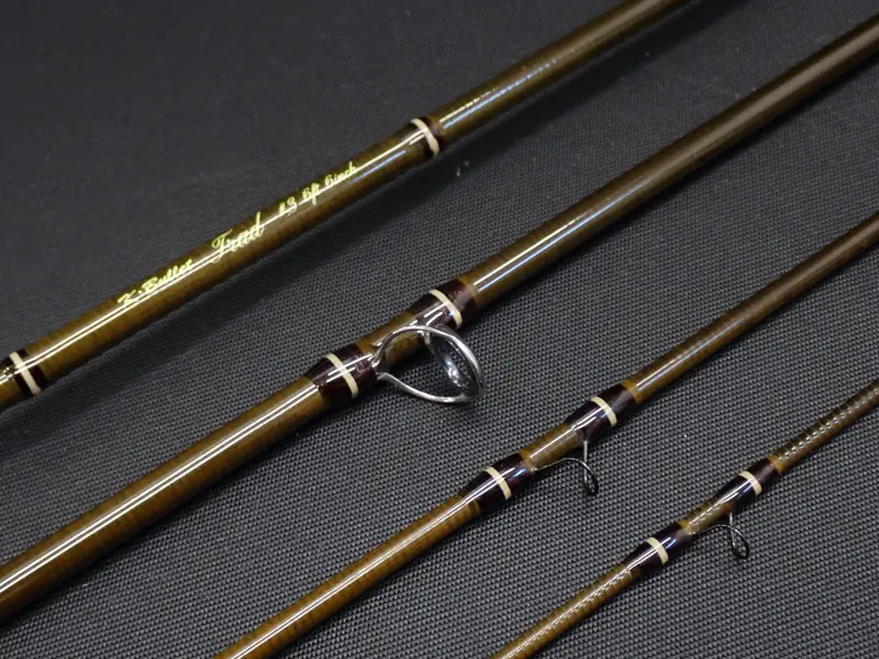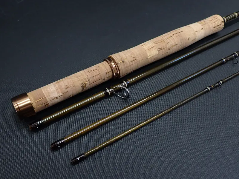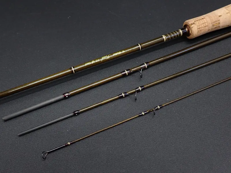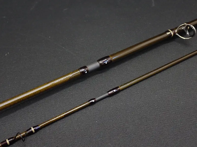 オリーブブラウンのブランクにダークブラウンとアイボリーの飾り巻き、コンパクトなグリップにコパーのリング&ポケットの金具、クラシカルで美しい仕上がりのショートロッドです。至近距離での釣りを想定しラインをほとんど出さない状態でもロッドを軽く振るだけでテップが俊敏に反応し、確りしたループによりフライを綺麗にターンさせるミディアムアクション。グリップの使用感多目。ブランクは綺麗です。