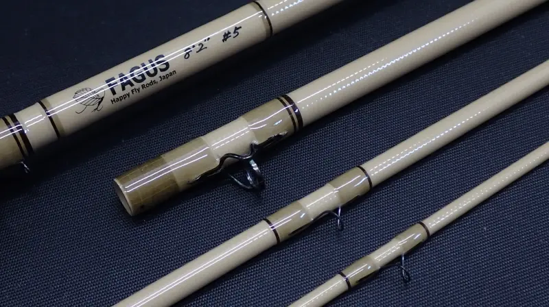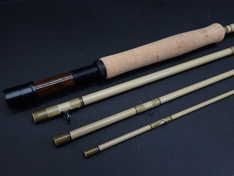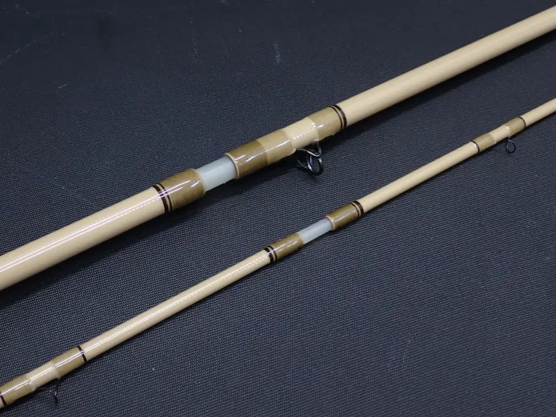 戻りの速いのユニディレクショナルSグラスをマテリアルとしたパワフルなファストアクション。ビッグドライや重いニンフを使った釣りにもお勧め。ナチュラルなビスケットカラーのブランクにウォールナットのフィラーの落ち着いた雰囲気のロッドです。大型トラウトとのファイトでも頼りになる一本。使用感かなり少な目。グリップに若干の汚れあり。