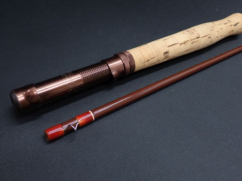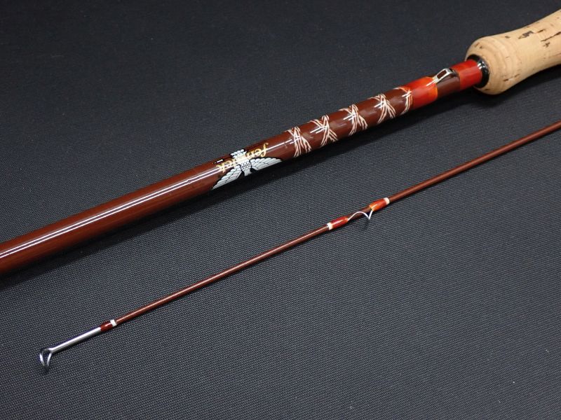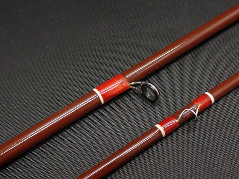 1970年代のオールドグラスロッド。MADE IN USA トルクフルな太いチョコレート色のブランクにワイルドな飾り巻。バット上部からゆったりとベンドし大きなドライフライやウェイトのあるニンフも余裕でポイントに運びます。レインボー狙いにも面白いロッド。のんびりとフライフィッシングを楽しむのにうってつけです。
