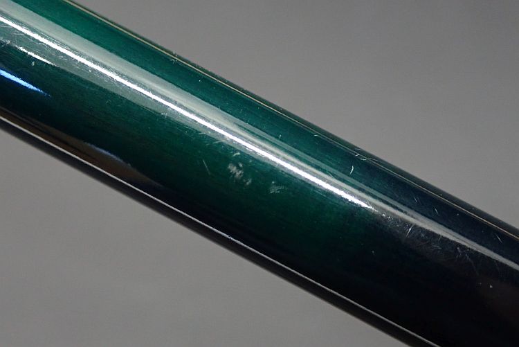 パワフルなファストアクションロッド。グリップの使用感が多目でコルクにパテ埋めが施されています。ブランクの置きキズもやや多めです。#2セクションのメス側フェルールにエポキシ塗装の削れ痕があり仕上げが乱れています。全体経年数相応の使用感がありますが、機能には問題がありません。